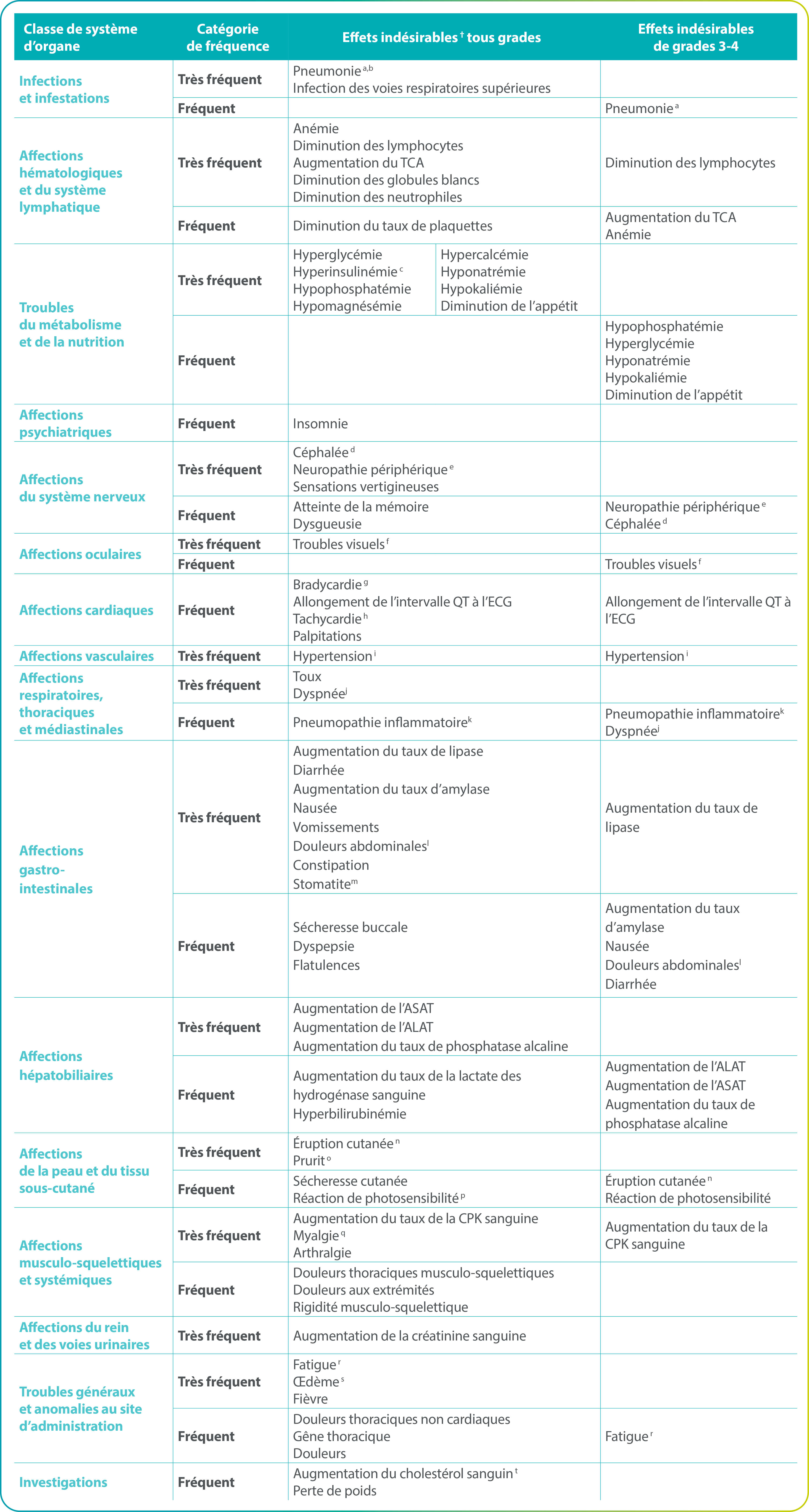 Les effets indésirables rapportés sont présentés dans le tableau suivant par classe de système d’organe, terme préférentiel et fréquence. Les catégories de fréquence sont : très fréquent (≥ 1/10) et fréquent (≥ 1/100 à < 1/10).