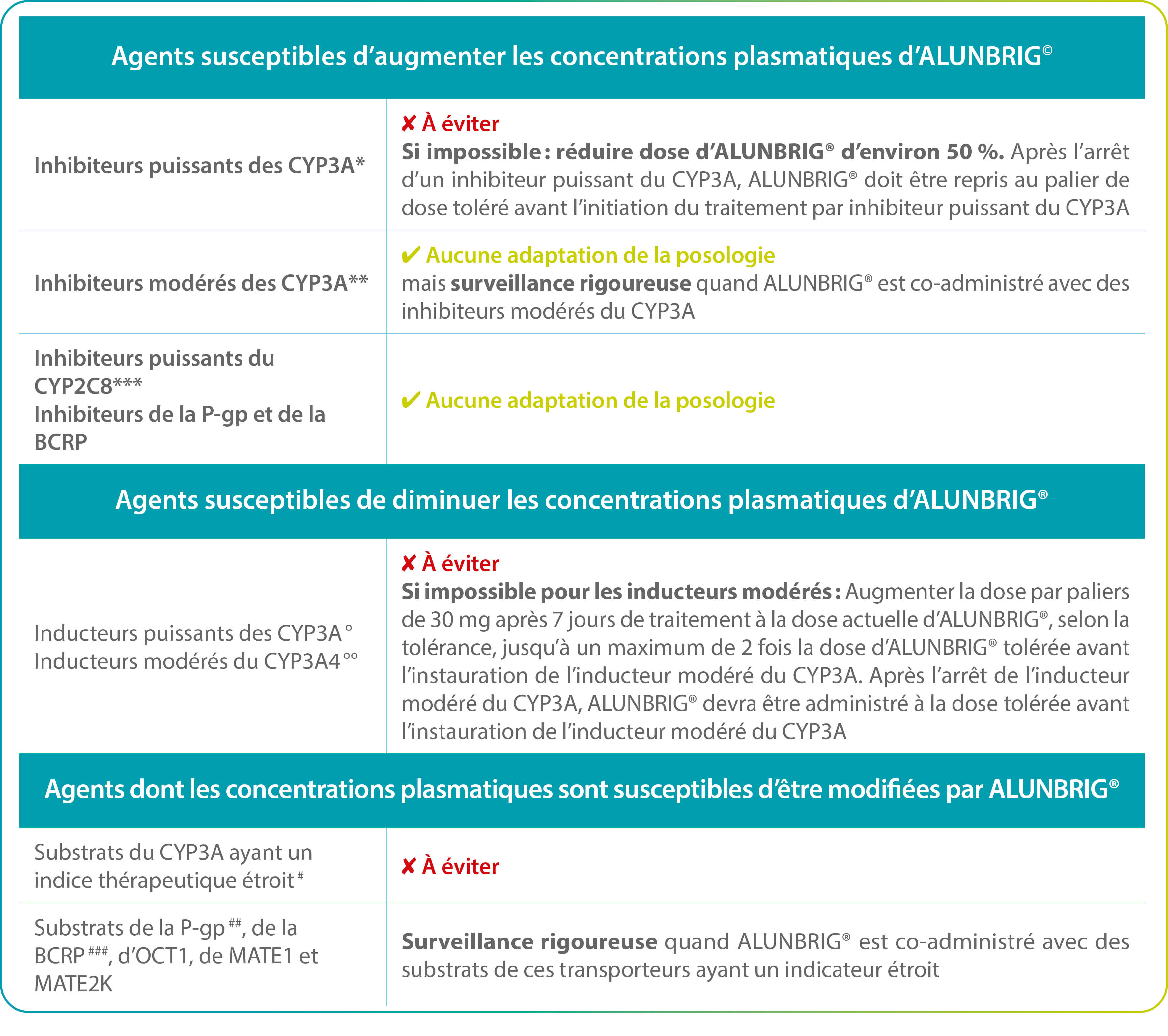 **par ex. diltiazepam et vérapamil. ***par ex. gemfibrozil. °par ex. rifampicine, carbamazépine, phénytoïne, rifabutine, phénobarbital et millepertuis. °°par ex. éfavirenz, modafinil, bosentan, étravirine et nafcilline. #par ex. alfentanil, fentanyl, quinidine, ciclosporine, sirolimus, tacrolimus. ##par ex. digoxine, dabigatran, colchicine, pravastatine. ###par ex. méthotrexate, rosuvastatine, sulfasalazine.