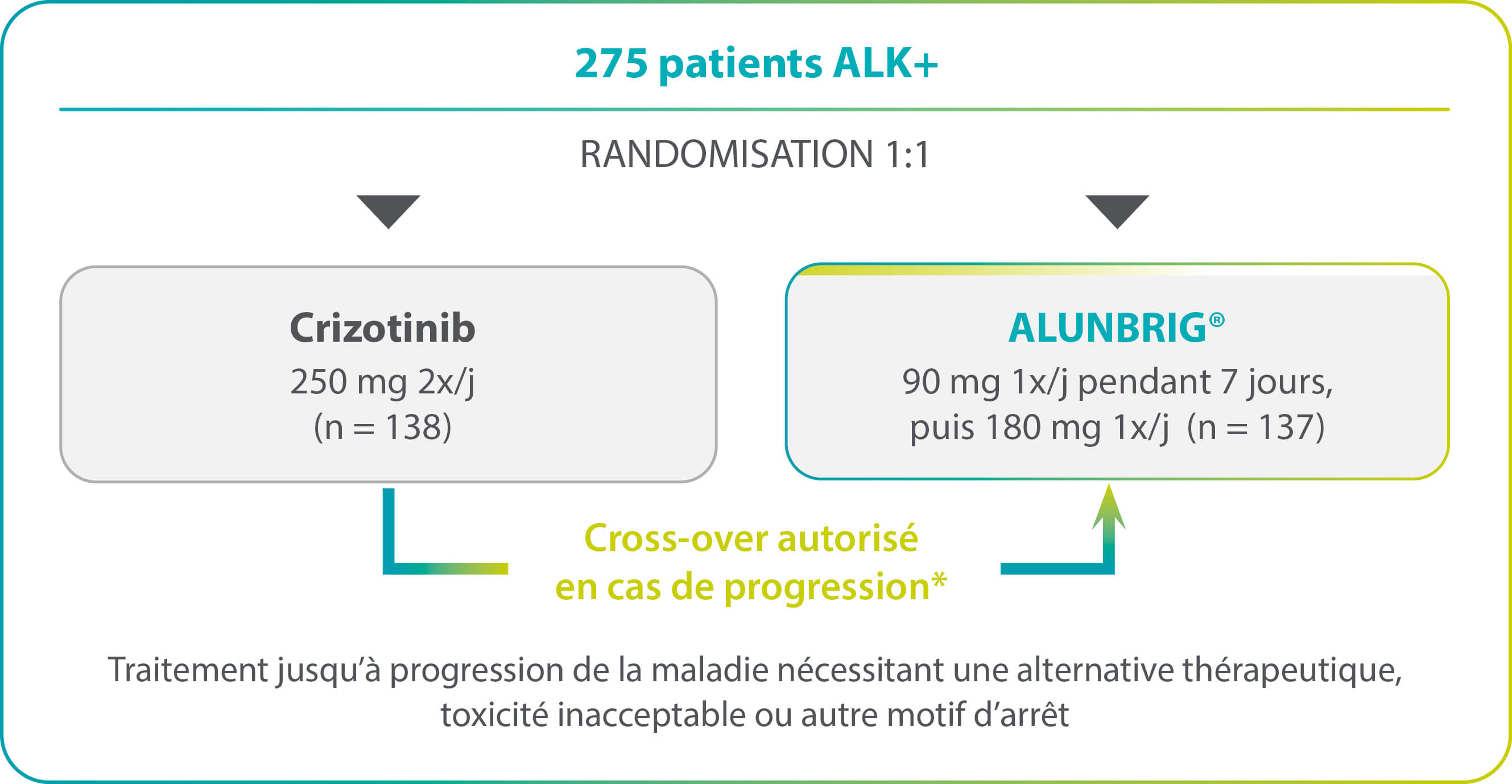 Évaluer l’efficacité et la tolérance d’ALUNBRIG® par rapport au crizotinib chez des patients atteints d’un CBNPC avancé ALK+ non préalablement traités par un inhibiteur d’ALK.