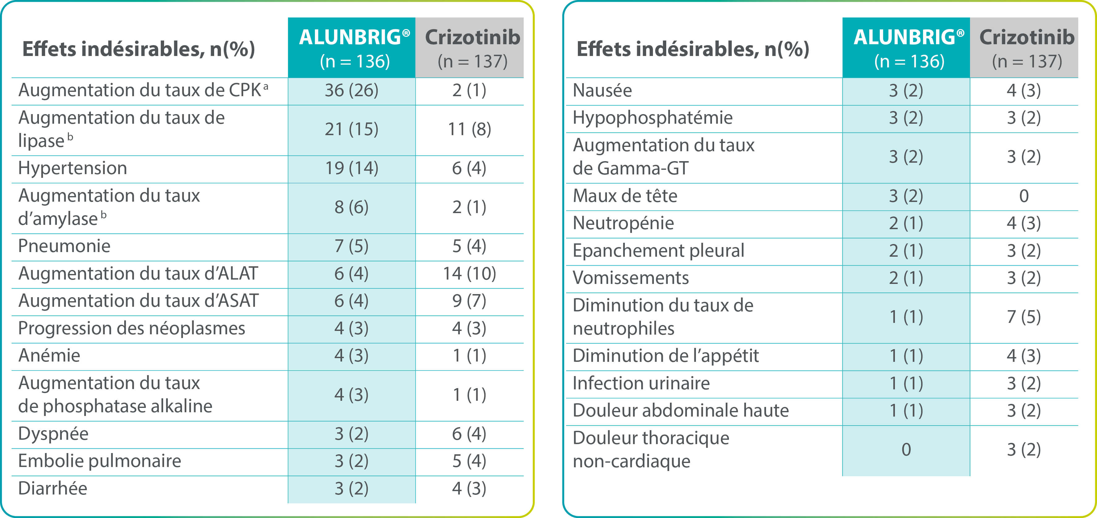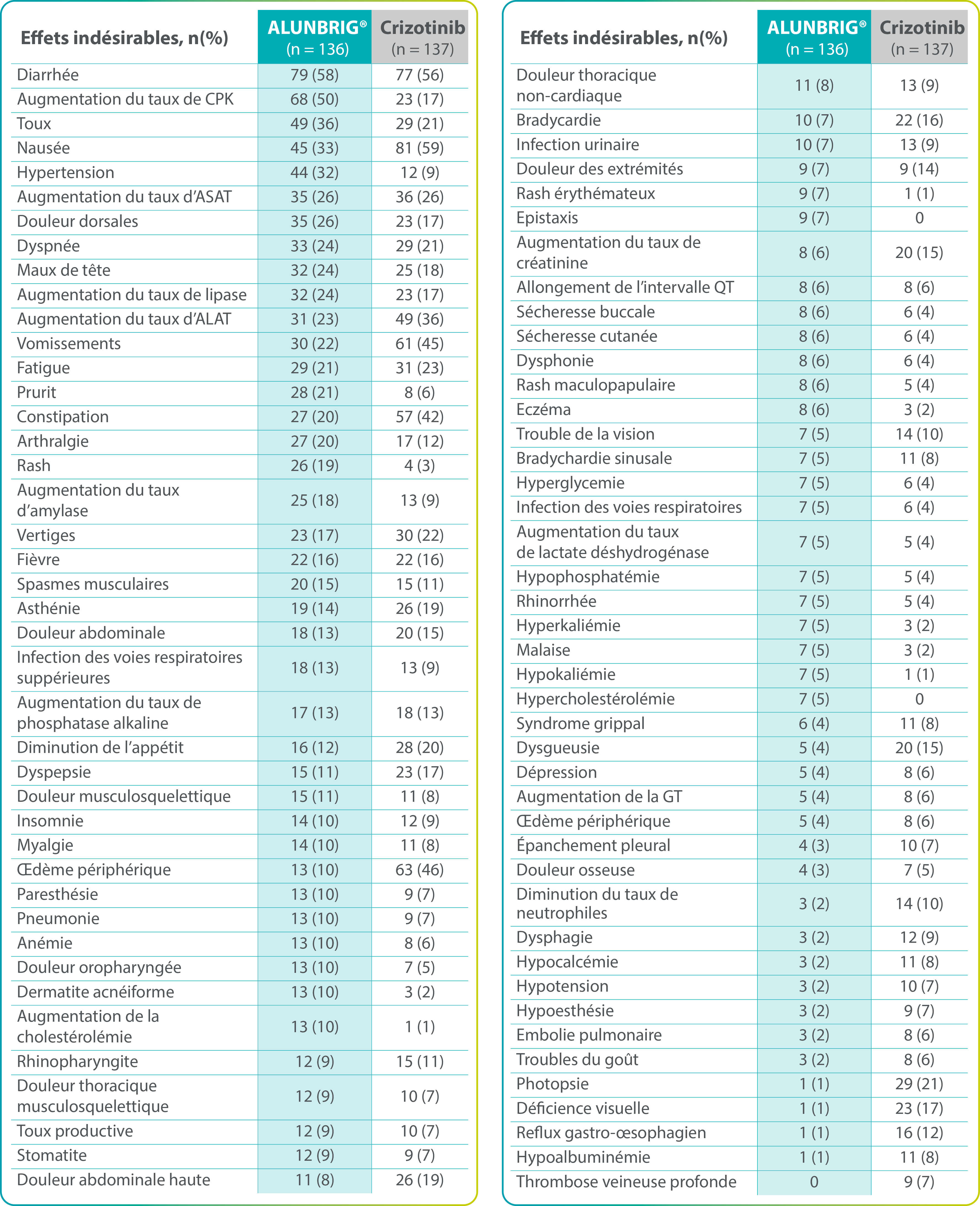 • grade 3 ou 4 : ALUNBRIG® 3 % (4/136) vs crizotinib 1/137 (<1 %)