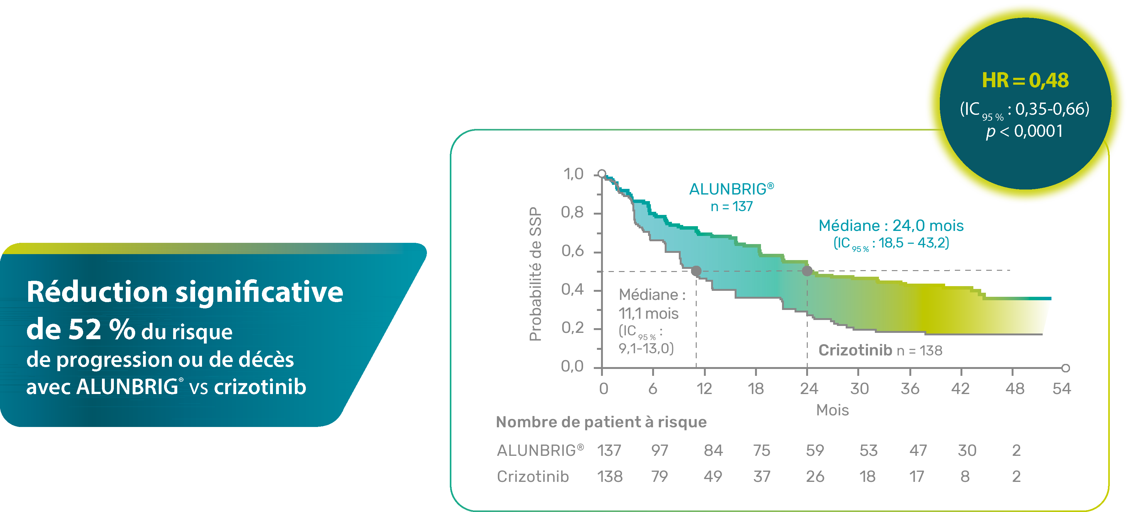 Survenue d’un évènement (progression, décès ou radiothérapie palliative) chez 53 % des patients traités par ALUNBRIG® et 67 % des patients traités par crizotinib