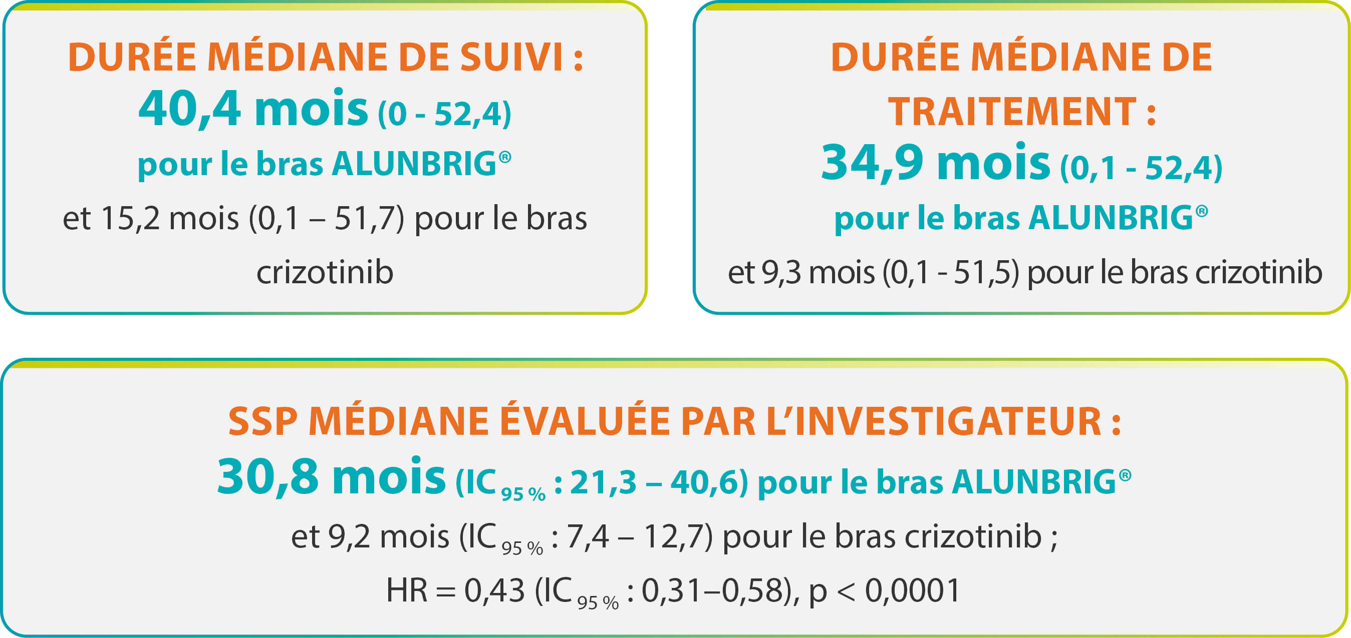 # Médiane de suivi : ALUNBRIG® : 40,4 mois et crizotinib : 15,2 mois.