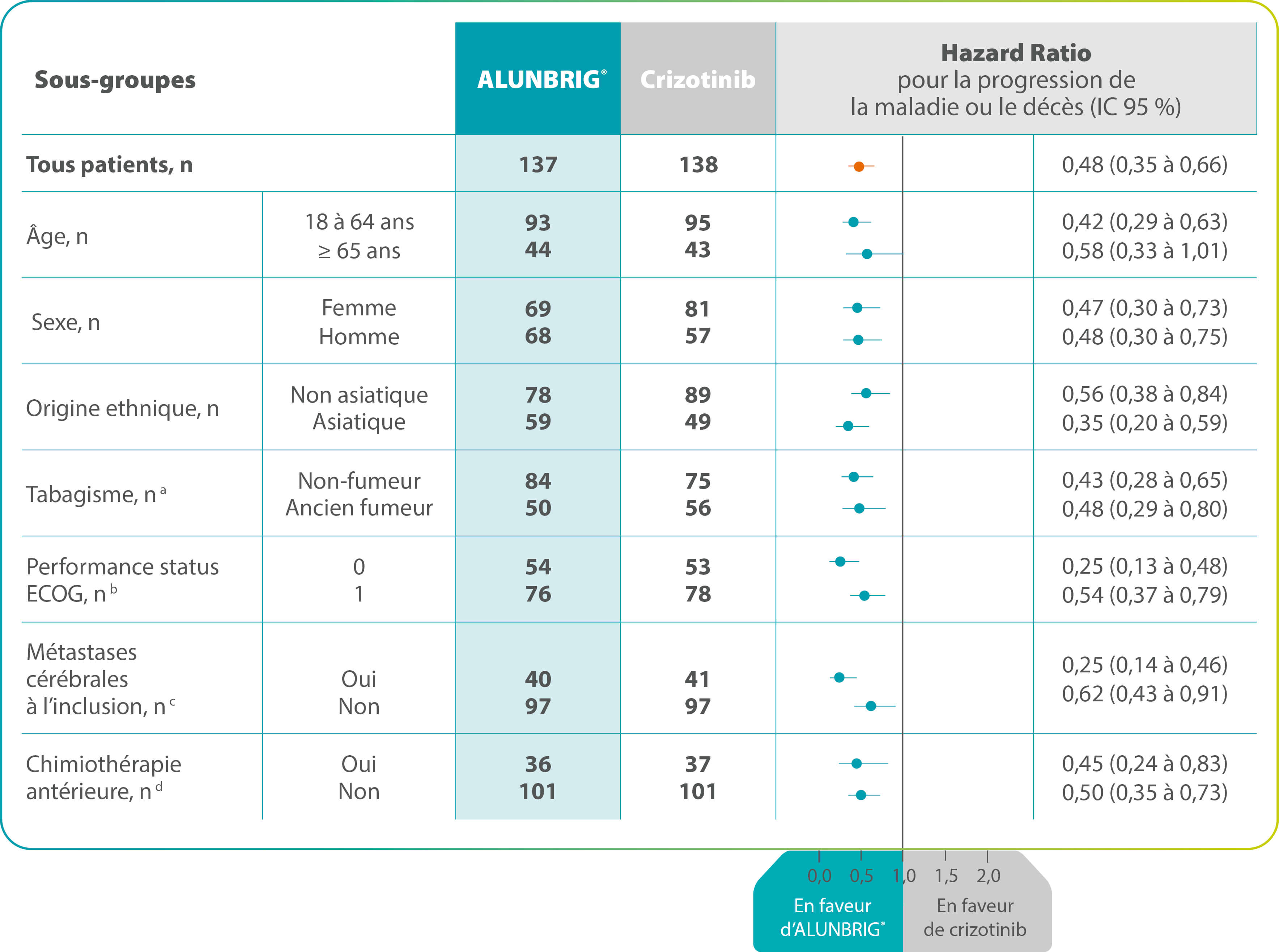 • b Hazard ratio non calculé en raison du nombre insuffisants de patients avec un statut EGOG égal à 2 (ALUNBRIG®, n = 7 ; crizotinib, n = 7).